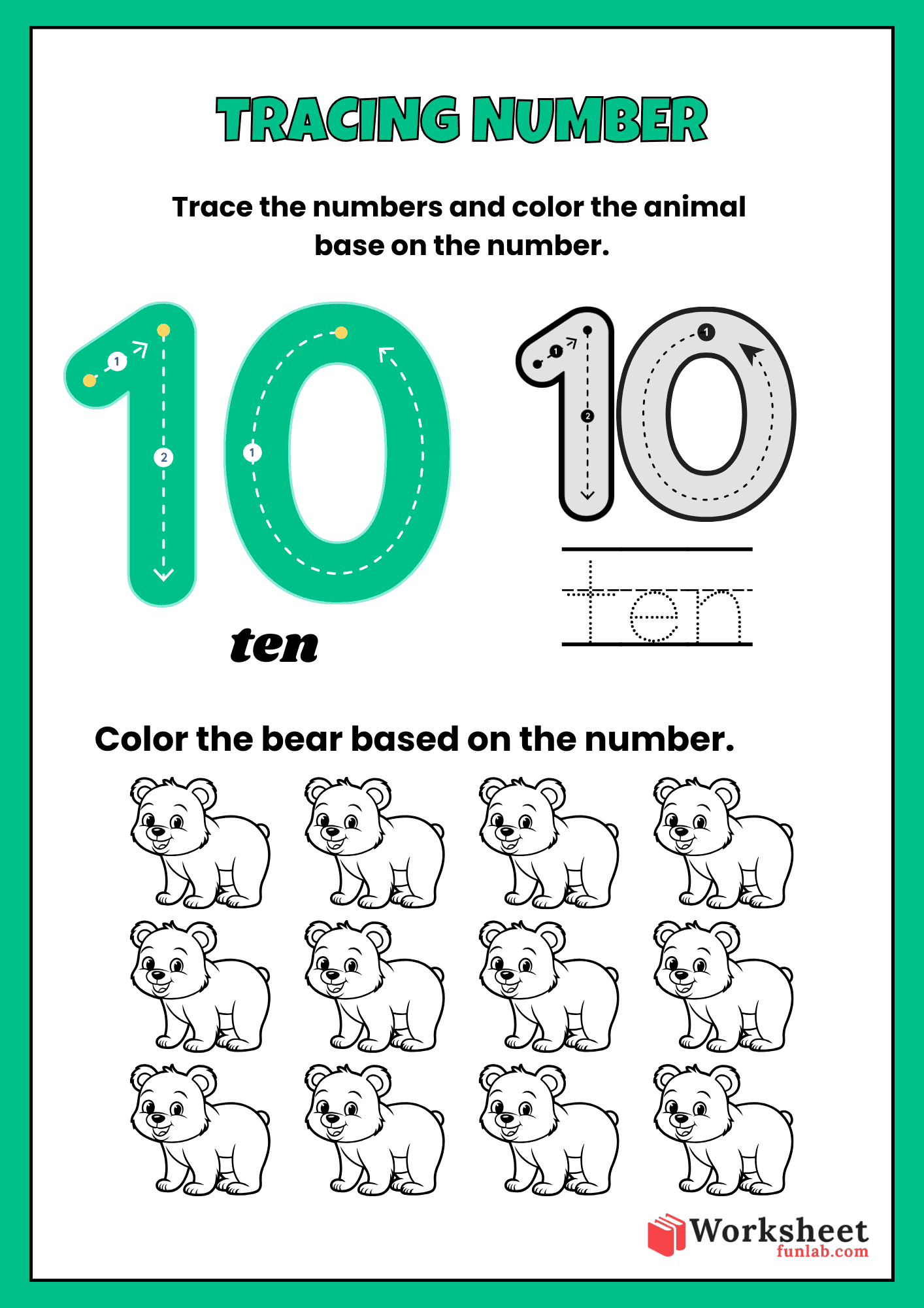 Word Handwriting Practice: Includes a dedicated space to trace the word “ten” to build early literacy and spelling skills.