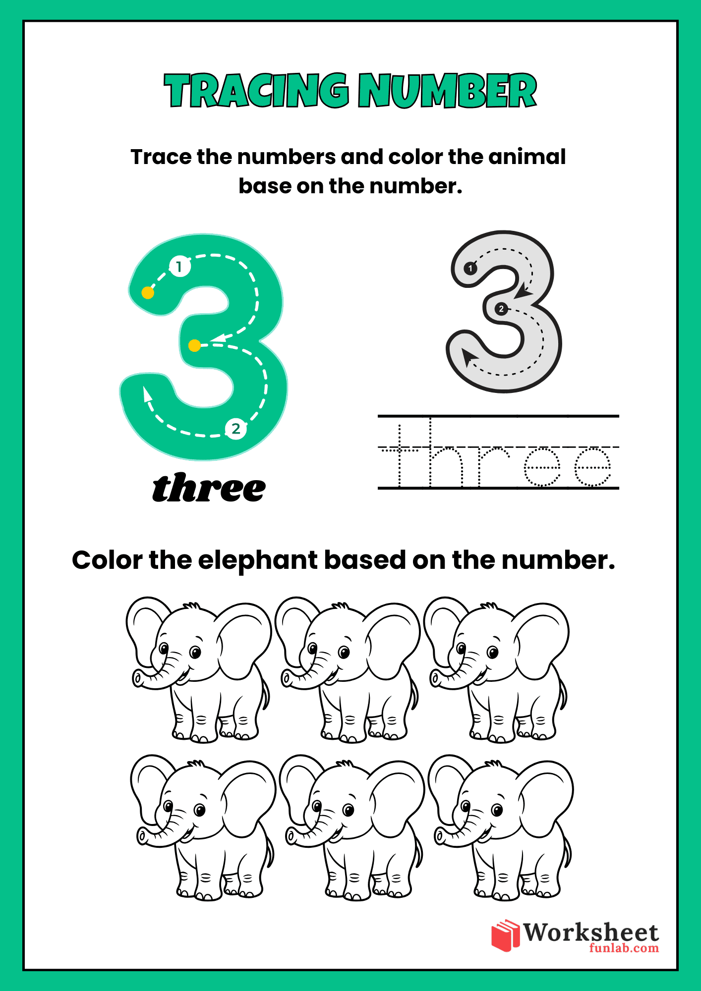 This interactive “Number 3” worksheet helps early learners master the third numeral through a blend of guided tracing and creative coloring. It is designed to build foundational math skills while keeping children engaged with cute elephant illustrations.
