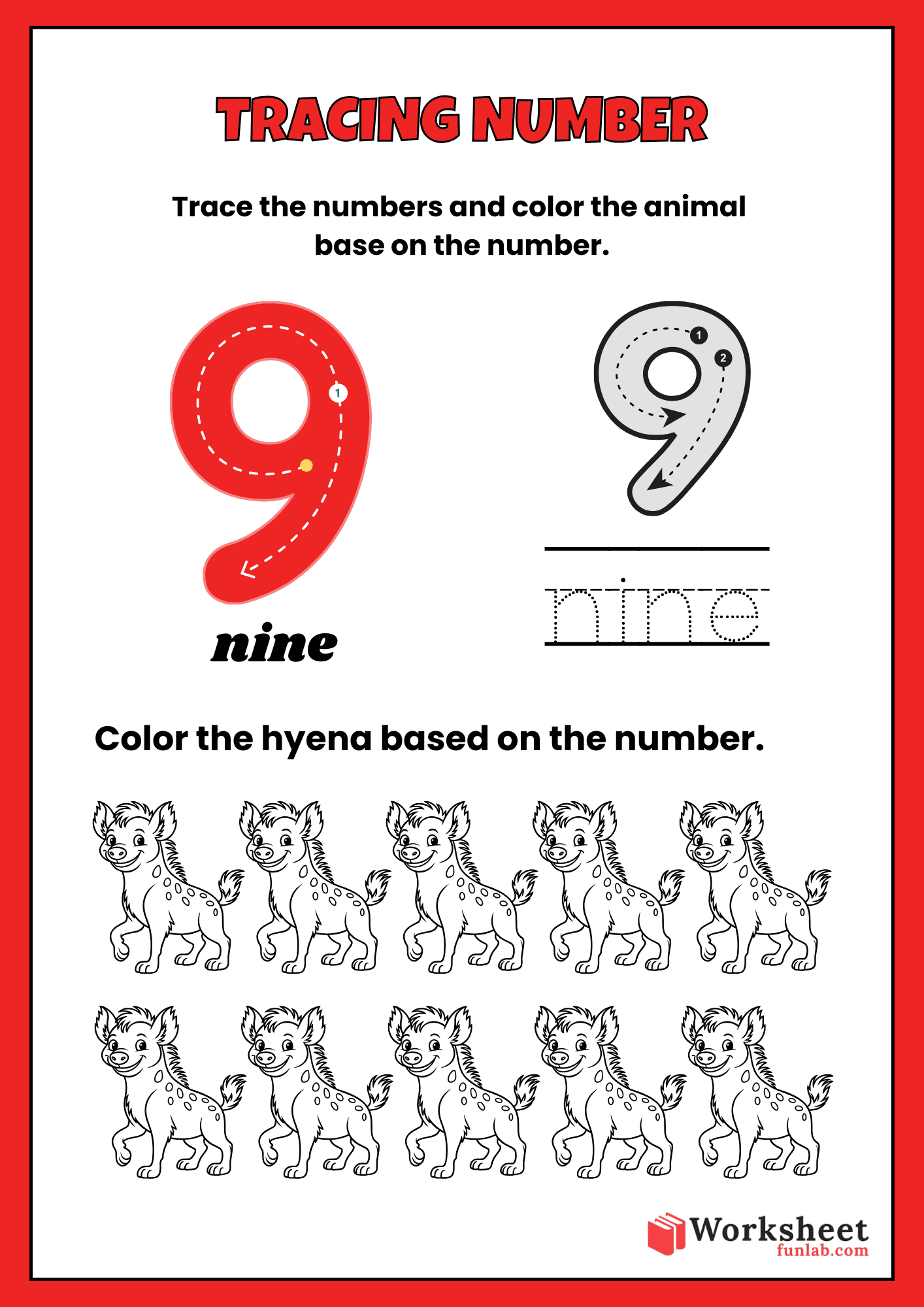 Color and Trace Number 9 Math Worksheet | Cute Hyenas