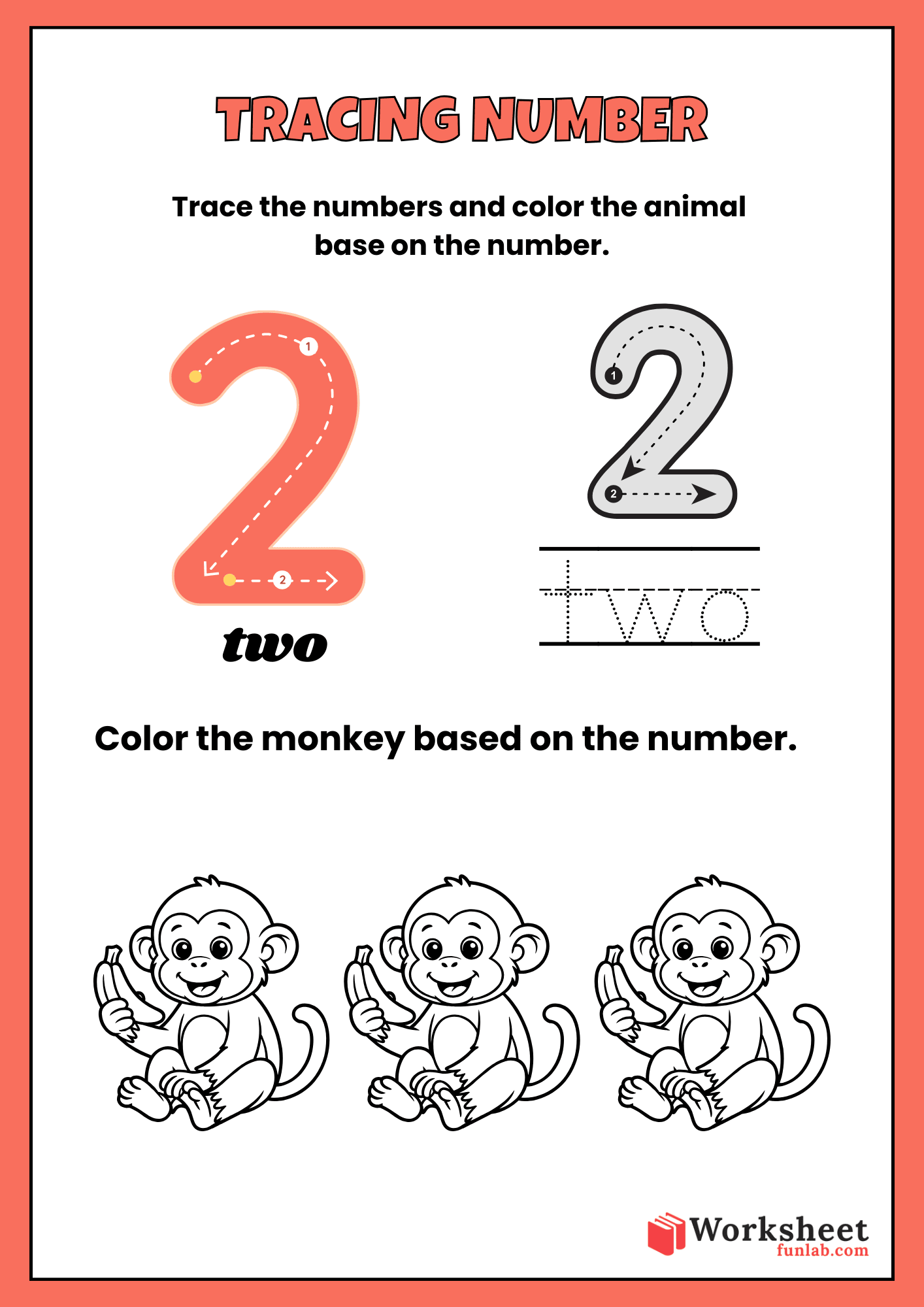 This interactive “Number 2” worksheet helps early learners master the second numeral through a blend of guided tracing and creative coloring. It is designed to build foundational math skills while keeping children engaged with cute monkey illustrations.