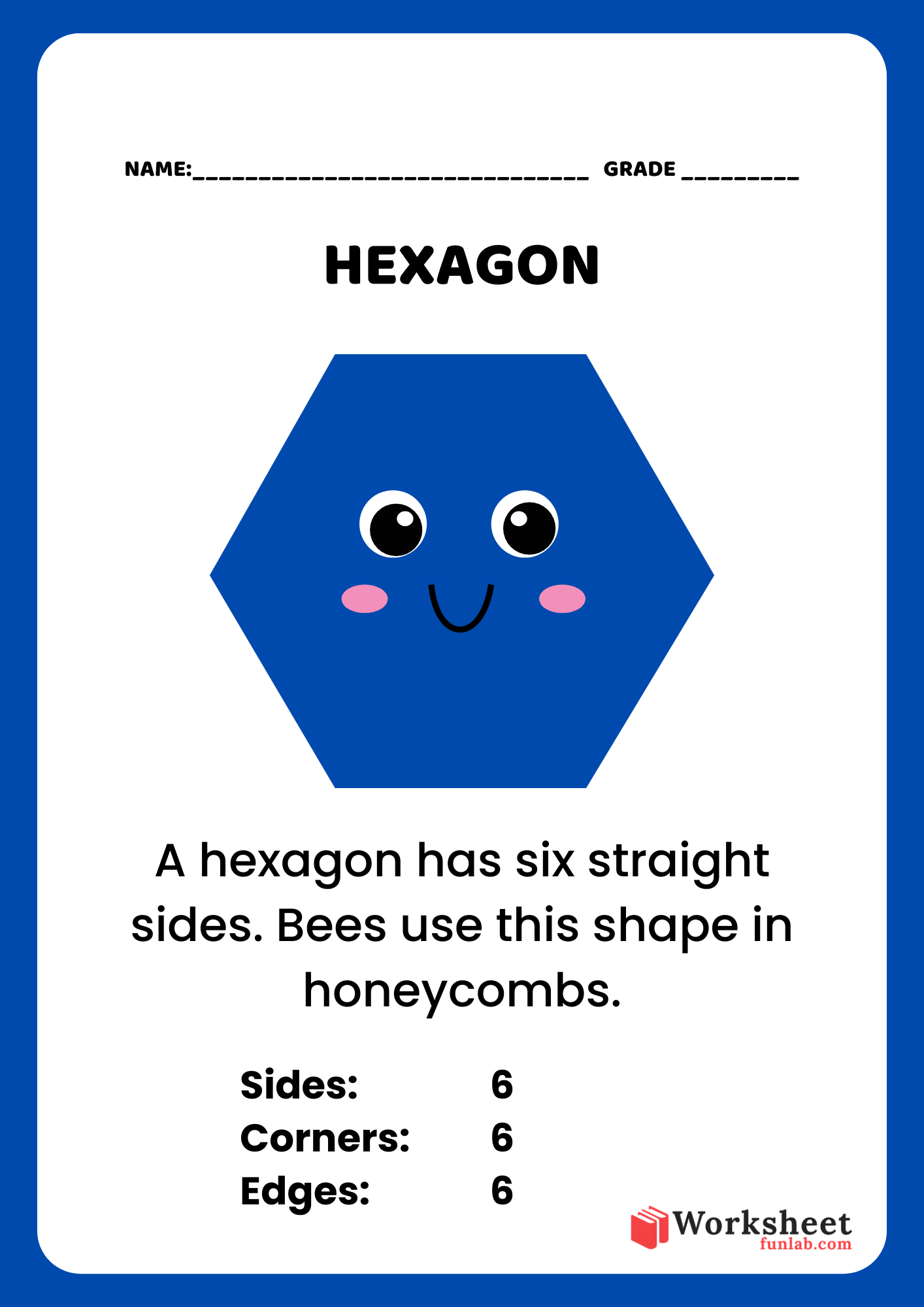 Featuring a friendly blue character, this printable guide explains that a hexagon has 6 straight sides, 6 corners, and 6 edges. It even includes a fun fact about how bees use this shape in honeycombs to help kids remember it.