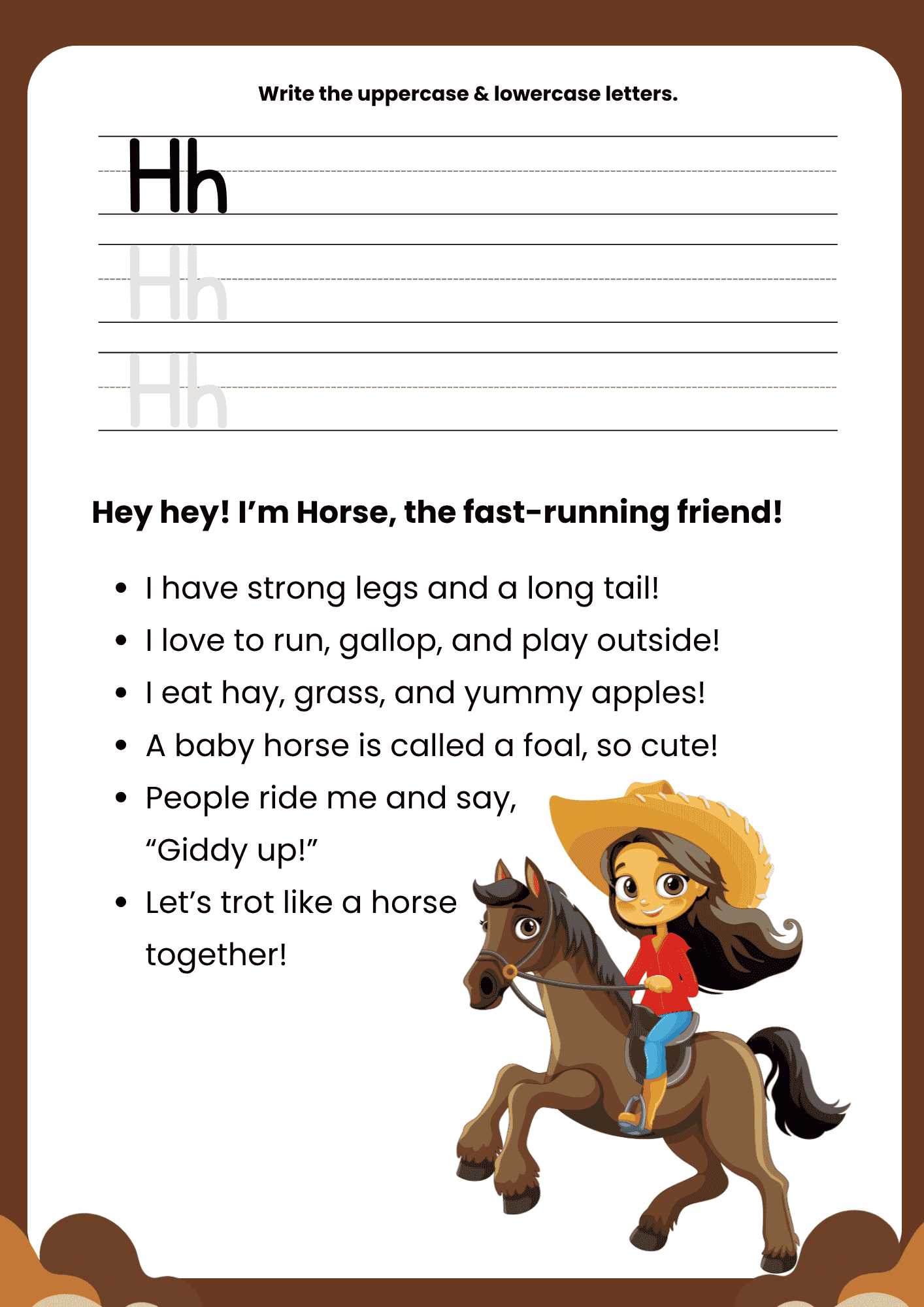 The Horse Story Letter H worksheet is helpful because it removes the intimidation of a blank page by combining education with storytelling. By providing a character-driven narrative about running, galloping, and playing outside, it builds the child’s confidence and interest immediately.