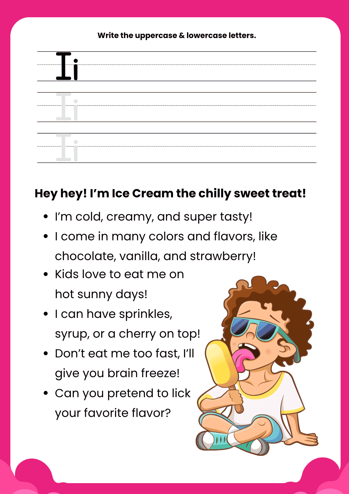 The Ice Cream Story Letter I worksheet is helpful because it removes the intimidation of a blank page by combining education with storytelling. By providing a character-driven narrative about being cold, creamy, and super tasty, it builds the child’s confidence and interest immediately.