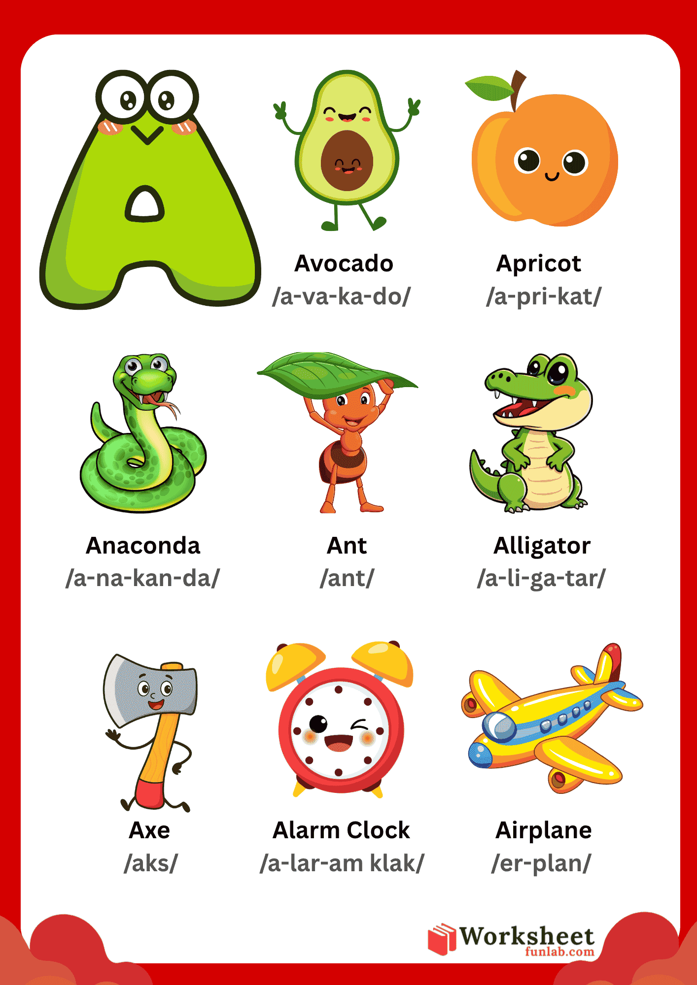 The Letter A Vocabulary Learning Chart is a vibrant and comprehensive educational poster designed to immerse preschoolers in the world of the first letter of the alphabet. Unlike simple tracing sheets, this chart focuses on expanding a child’s lexicon by connecting the letter “A” to a diverse group of objects, animals, and fruits.