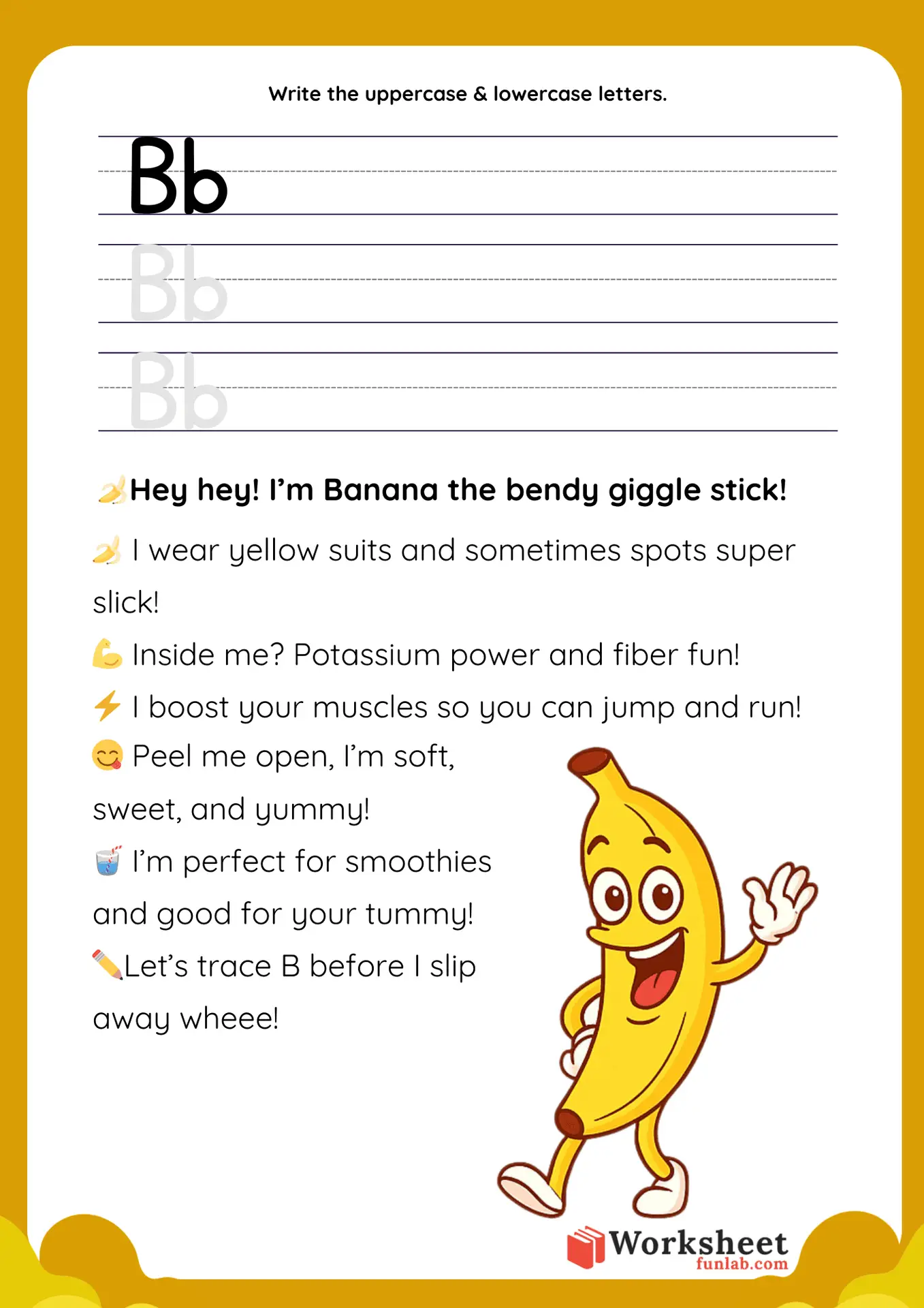 Help kids learn the letter B with this fun tracing worksheet set. Children can practice writing uppercase and lowercase B while enjoying a cute mini-story from “Banana the Bendy Giggle Stick.” The mix of tracing and storytelling keeps little learners engaged, improves handwriting, and makes letter recognition easy and enjoyable. Perfect for preschool and kindergarten activities.