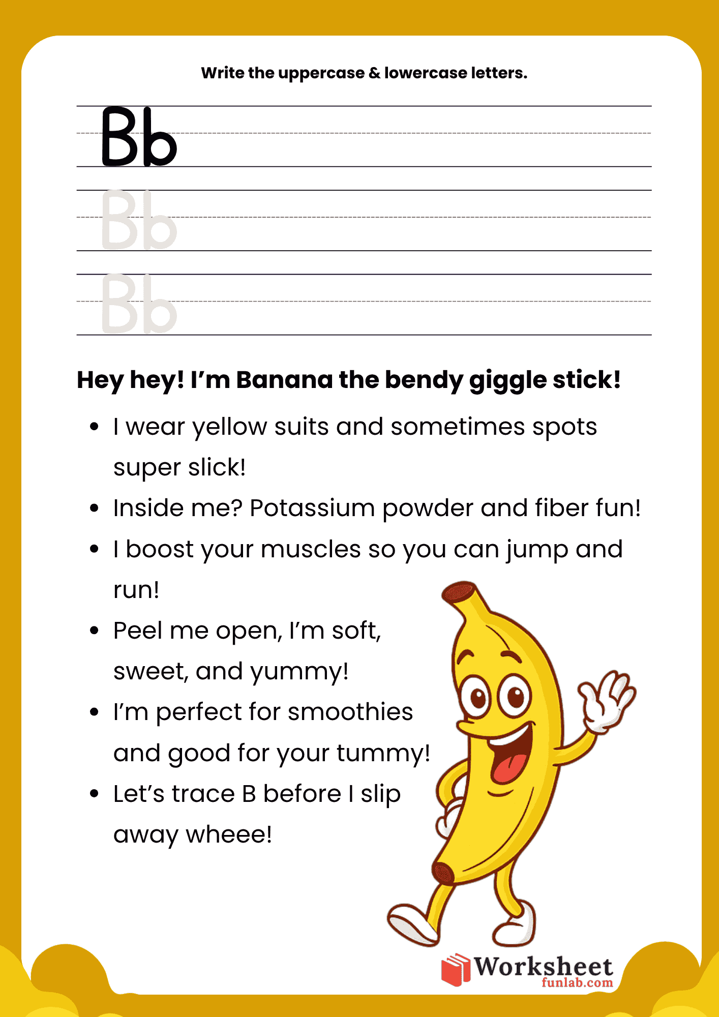 Kids will enjoy their Letter B Writing Practice with this engaging and interactive worksheet featuring a fun banana-themed adventure.