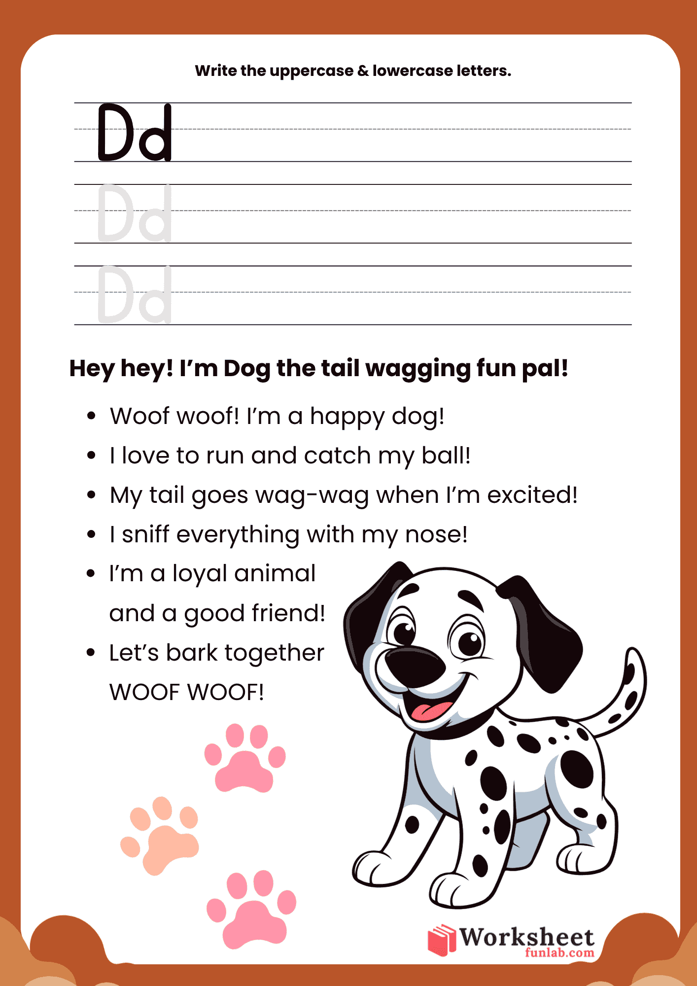 This worksheet features a cheerful brown dog character that guides children through the learning process, making the transition from letter recognition to writing a joyful experience.
