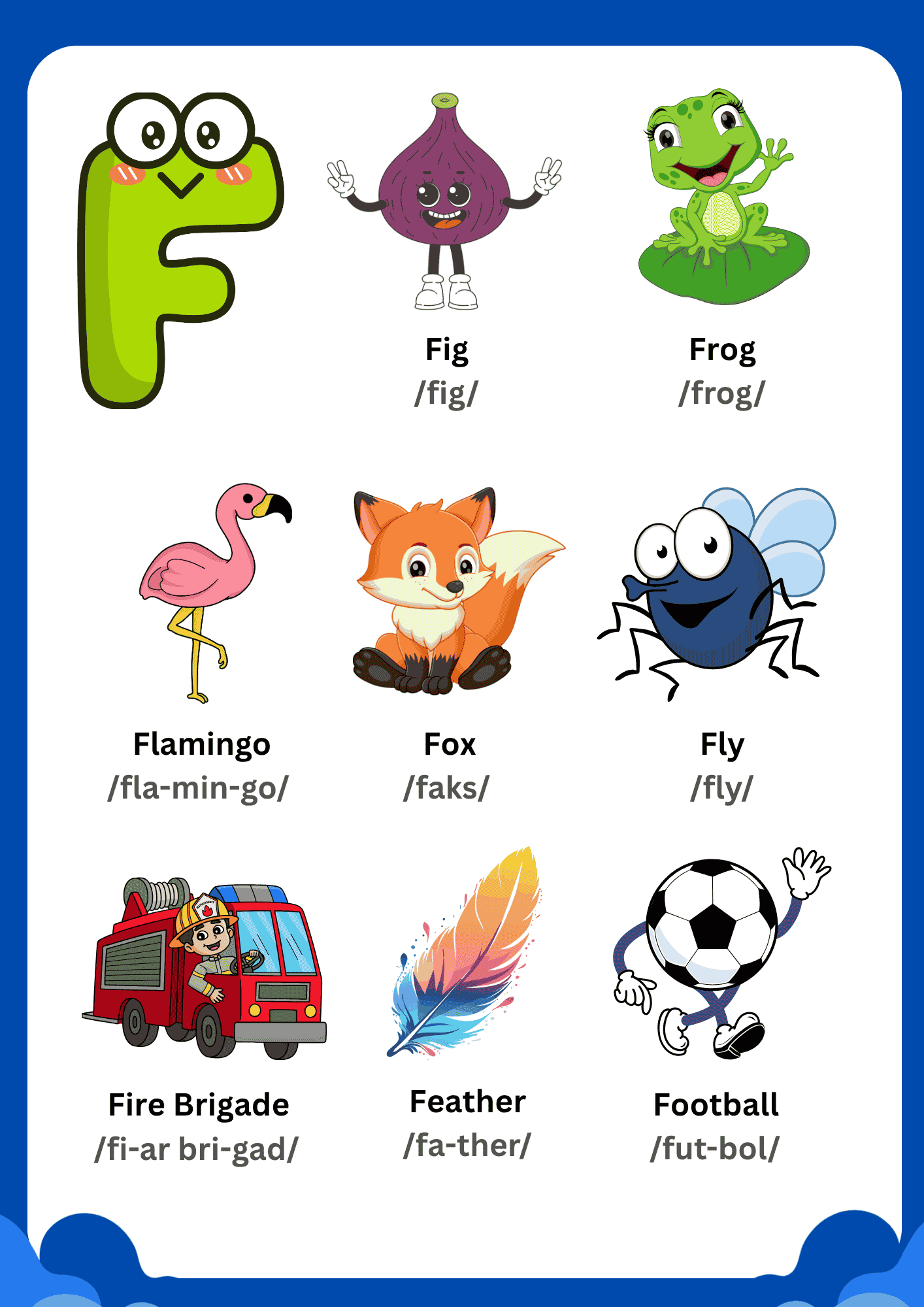 A unique feature of this Learning Chart is the inclusion of phonetic pronunciation guides (e.g., /fla-min-go/ for Flamingo), which helps children practice the correct sounds of each syllable. This dual-focus on visual recognition and auditory pronunciation makes this Letter F Vocabulary Learning Chart a well-rounded tool for literacy.