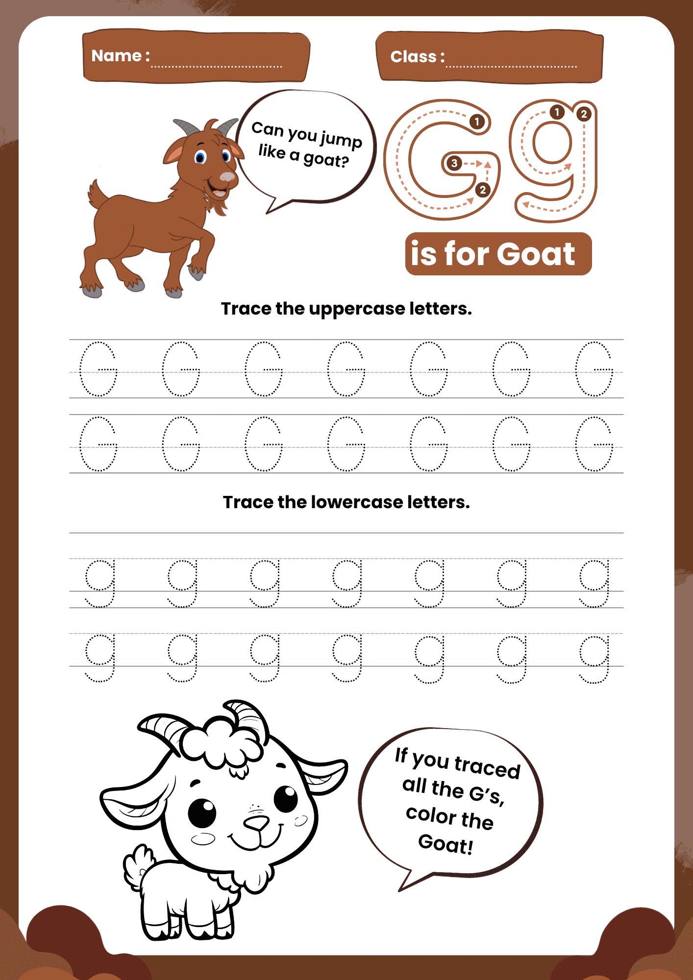 Warm Up: Trace the letter in the air with a finger while saying “G is for Goat” aloud and mimicking a jumping goat!