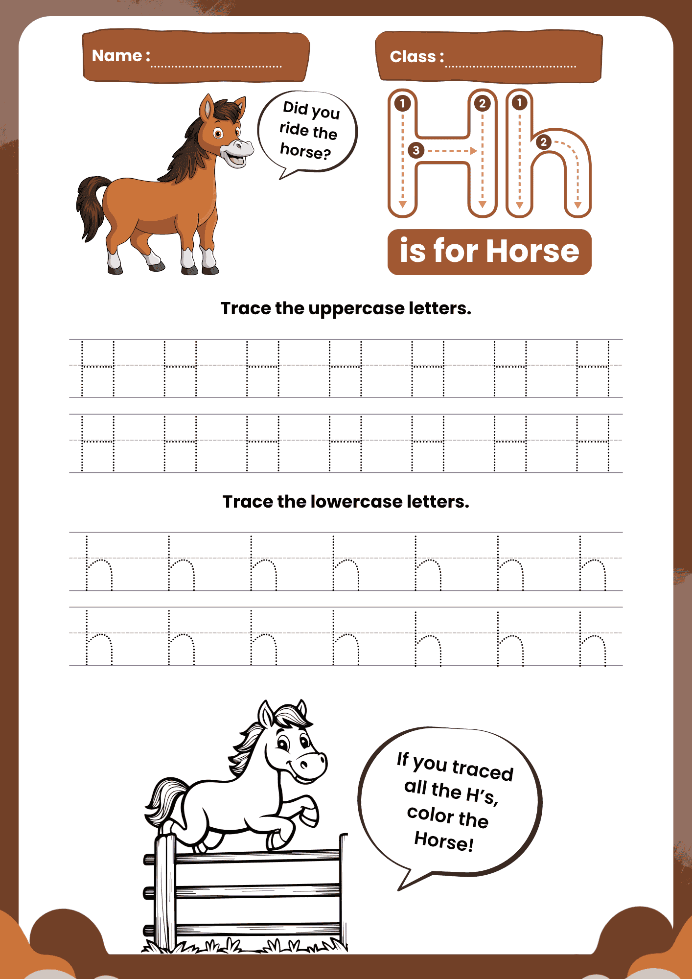 Kids will enjoy using this engaging and interactive Letter H Tracing Worksheet to discover the letter H, practice both uppercase and lowercase forms, and build strong foundational literacy skills while coloring a friendly horse.