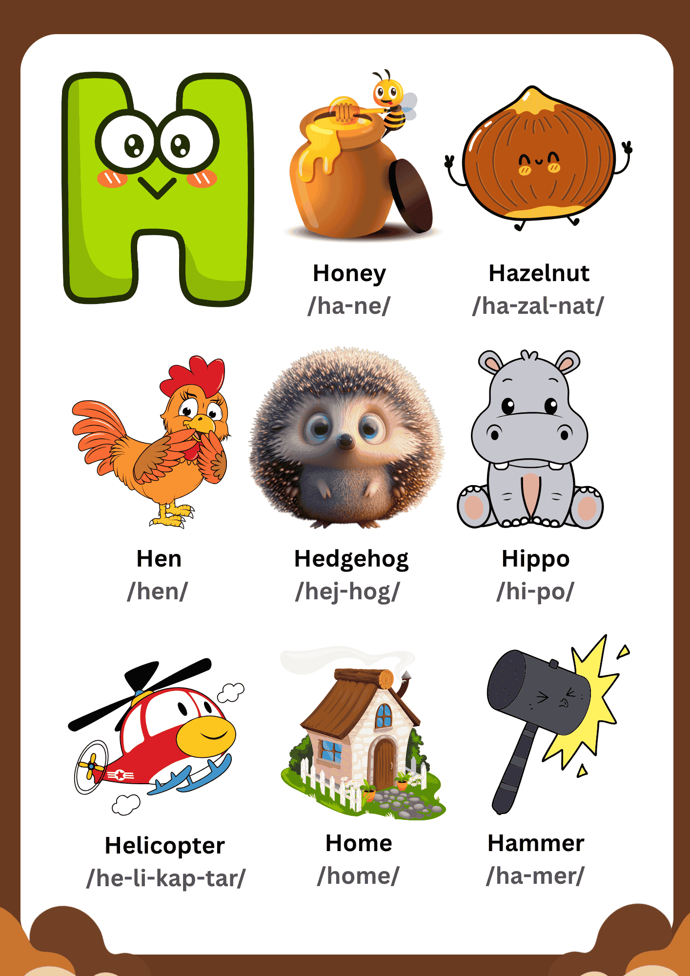 A unique feature of this Letter H Vocabulary Learning Chart is the inclusion of phonetic pronunciation guides (e.g., /he-li-kap-tar/ for Helicopter), which helps children practice the correct sounds of each syllable. This dual-focus on visual recognition and auditory pronunciation makes this Letter H Vocabulary Learning Chart a well-rounded tool for literacy.