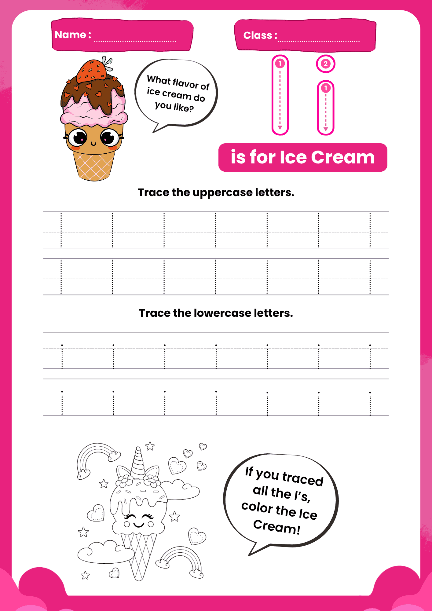• Warm Up: Trace the letter in the air with a finger while saying “I is for Ice Cream” aloud.