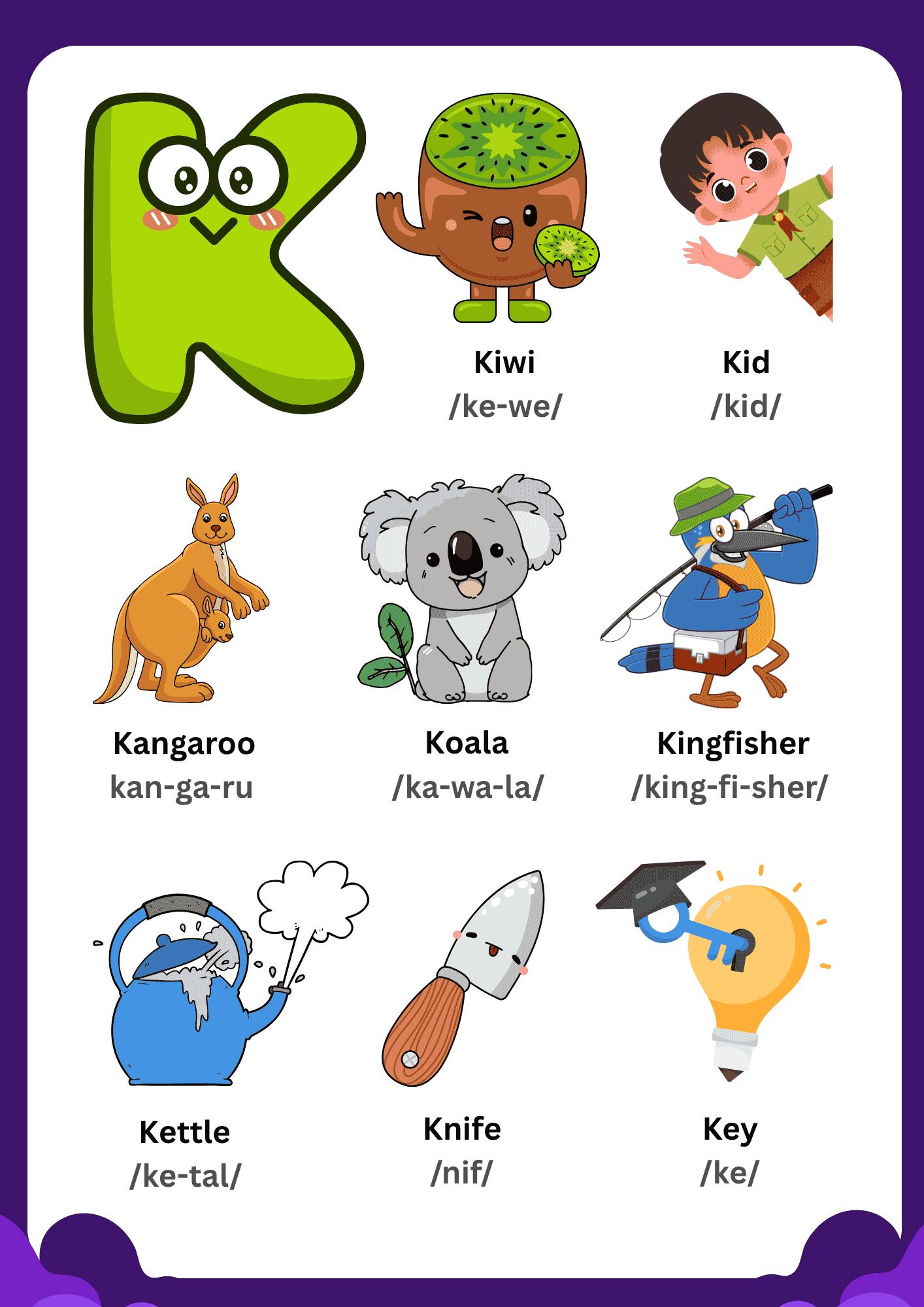A unique feature of this Letter K Vocabulary Learning Chart is the inclusion of phonetic pronunciation guides (e.g., /ka-wa-la/ for Koala), which helps children practice the correct sounds of each syllable. This dual-focus on visual recognition and auditory pronunciation makes this chart a well-rounded tool for early literacy.