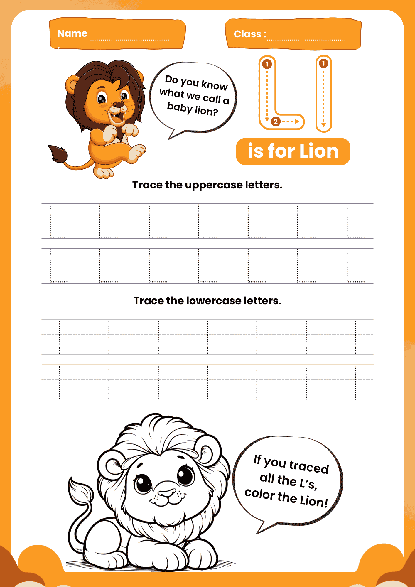 • Warm Up: Trace the letter in the air with a finger while asking, “Do you know what we call a baby lion?”
