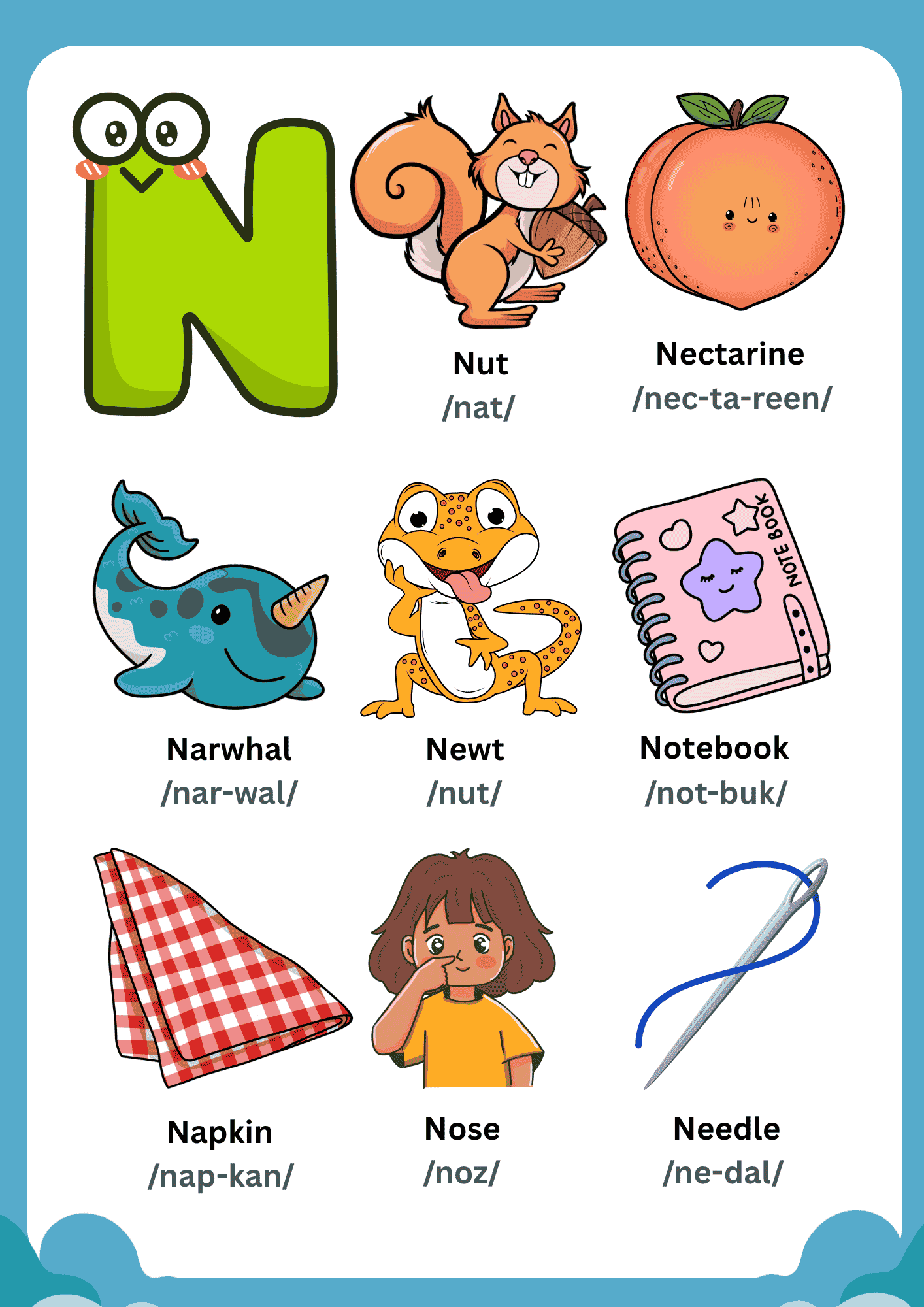 A unique feature of this Letter N Vocabulary Learning Chart is the inclusion of phonetic pronunciation guides (e.g., /nec-ta-reen/ for Nectarine), which helps children practice the correct sounds of each syllable. This dual-focus on visual recognition and auditory pronunciation makes this chart a well-rounded tool for early literacy.