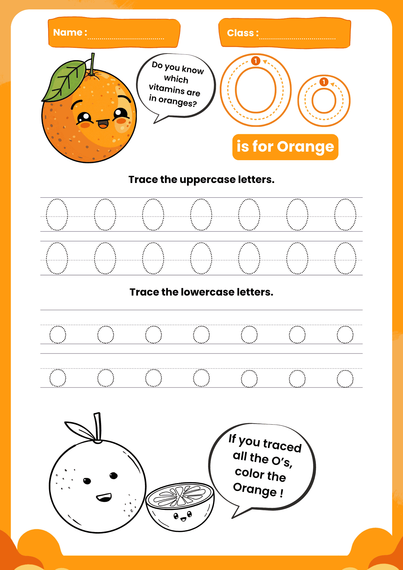 Warm Up: Trace the letter in the air with a finger while asking, “Do you know which vitamins are in oranges?”