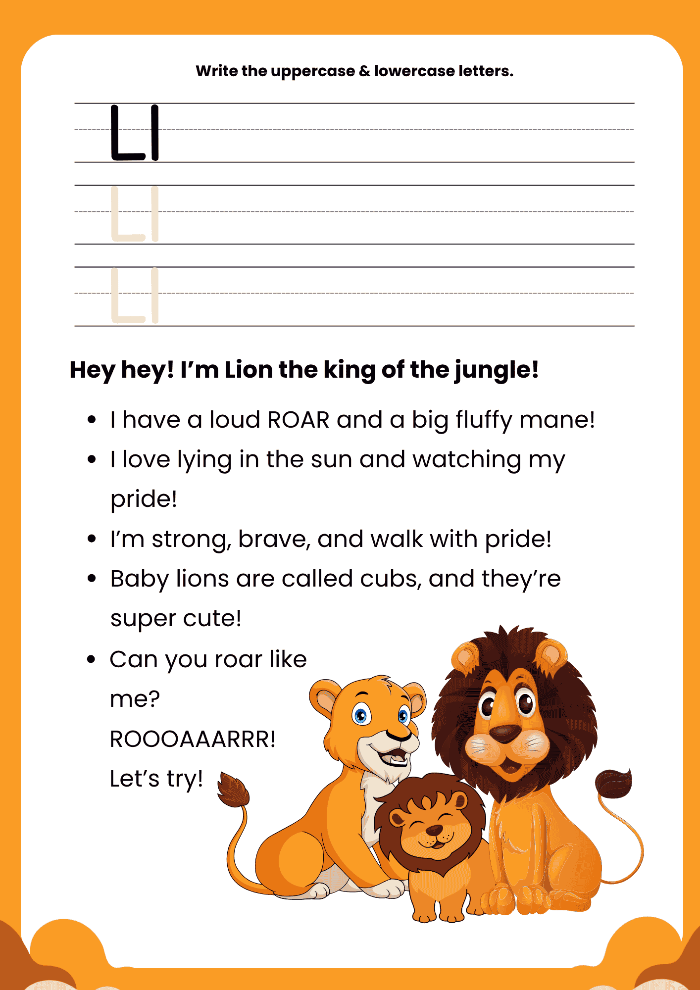 This worksheet serves as a bridge between recognizing a letter and using it in a real-world context. The inclusion of interesting facts about lions lying in the sun and watching their pride ensures that the child stays engaged, making it much more likely that they will retain the information long-term.