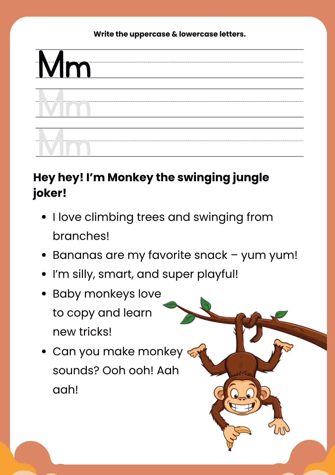 This worksheet serves as a bridge between recognizing a letter and using it in a real-world context. The inclusion of interesting facts about monkeys climbing trees and swinging from branches ensures that the child stays engaged, making it much more likely that they will retain the information long-term.