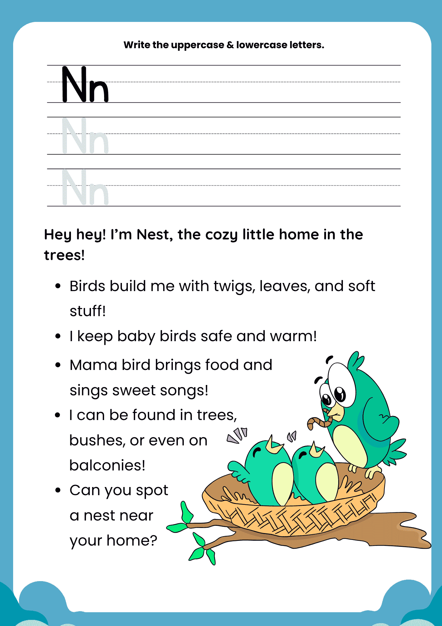 The Nest Story Letter N worksheet is helpful because it removes the intimidation of a blank page by combining education with storytelling. By providing a narrative about homes built with twigs and leaves, it builds the child’s confidence and interest immediately.