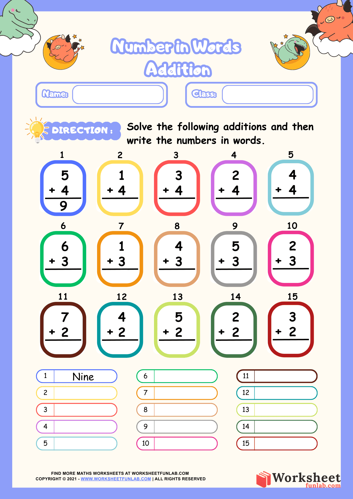 Free Printable Single-Digit Addition Worksheet | Number in Words Addition Worksheet