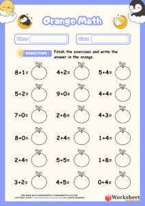 This "Orange Math" worksheet is a printable educational resource designed for early learners to practice single-digit addition. It features 18 math problems where students write the sum inside an orange graphic, combining basic arithmetic with fun, visual elements.