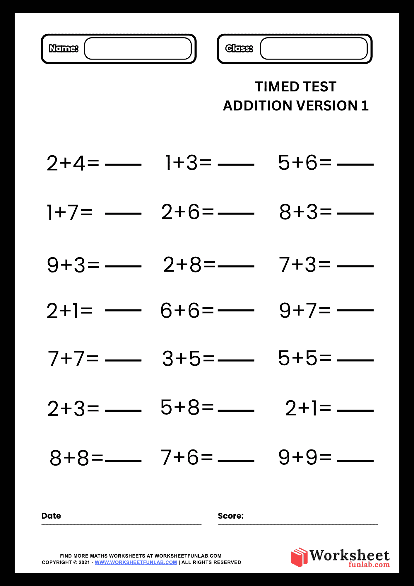 Timed Addition Test Version 1 – Single Digit Math Practice Worksheet for Kids