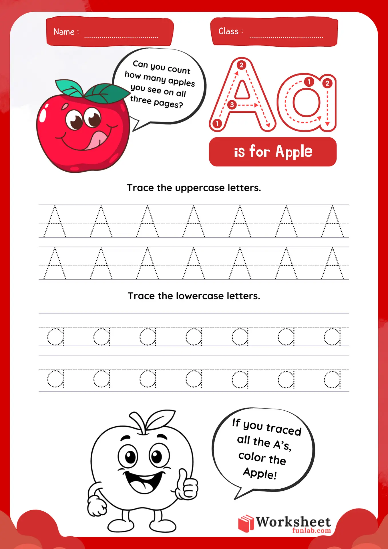 ✍️ Tracing Practice: Focuses on tracing the uppercase A and lowercase a to build essential handwriting skills.
